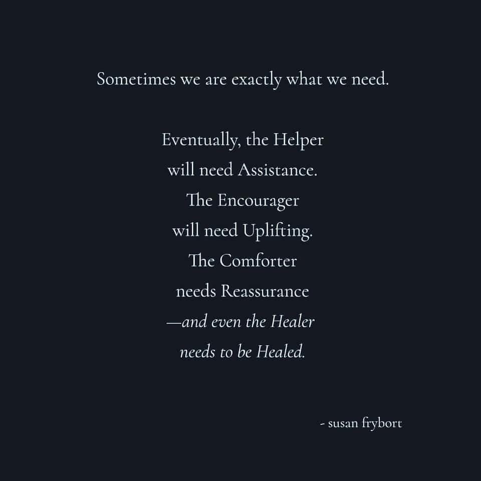 Eventually, the Helper will need Assistance. The Encourager will need Uplifting. The Comforter needs Reassurance —and even the Healer needs to be Healed.