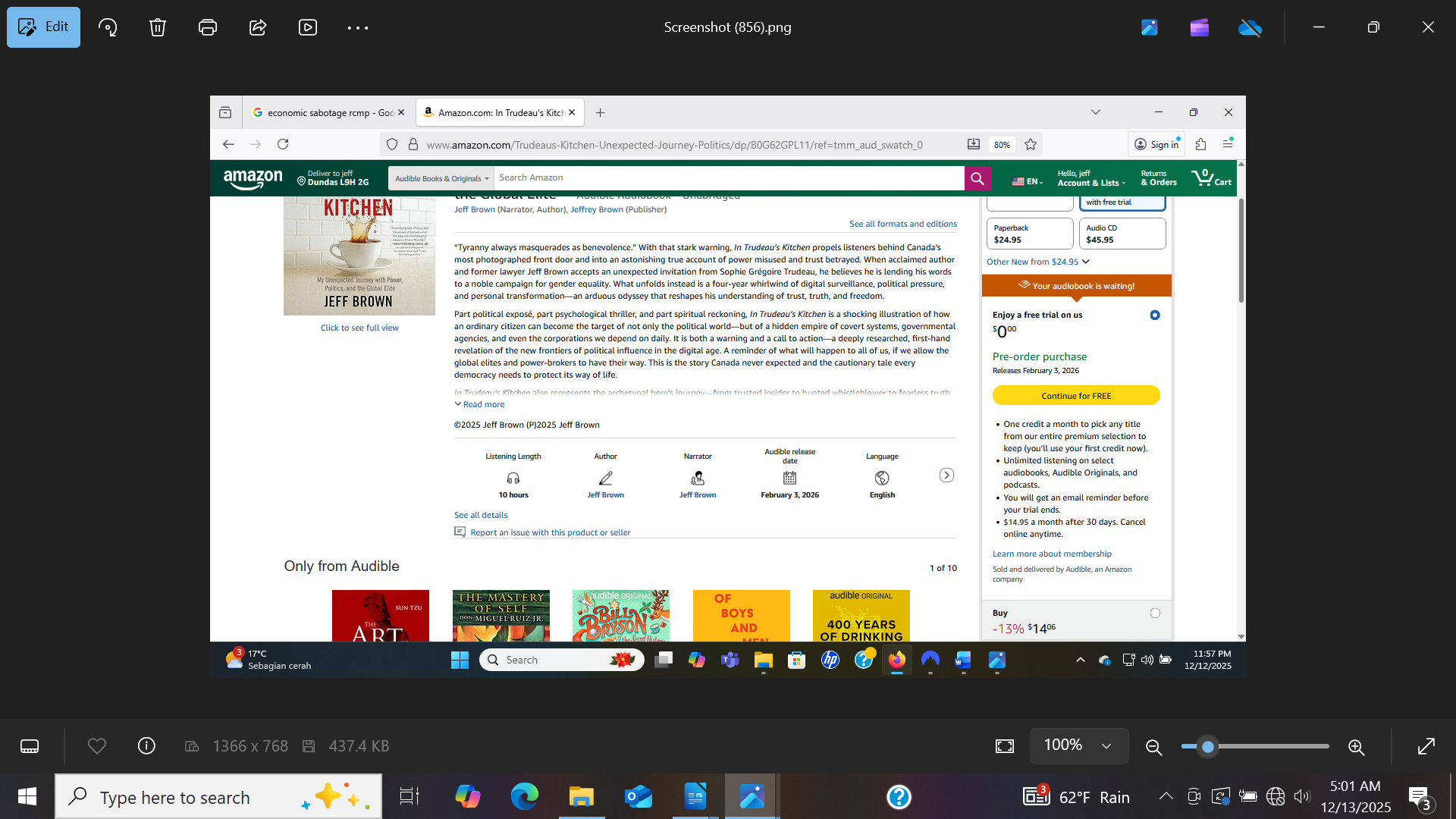 Around the same time, I noticed that the audiobook (deal signed with Blackstone Publishing) reverted back to old non-images without order links, also on Amazon Canada. This image is what Amazon Canada showed on November 25th..
